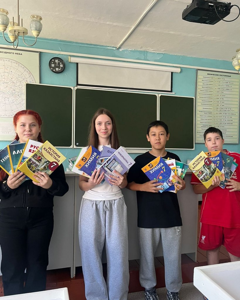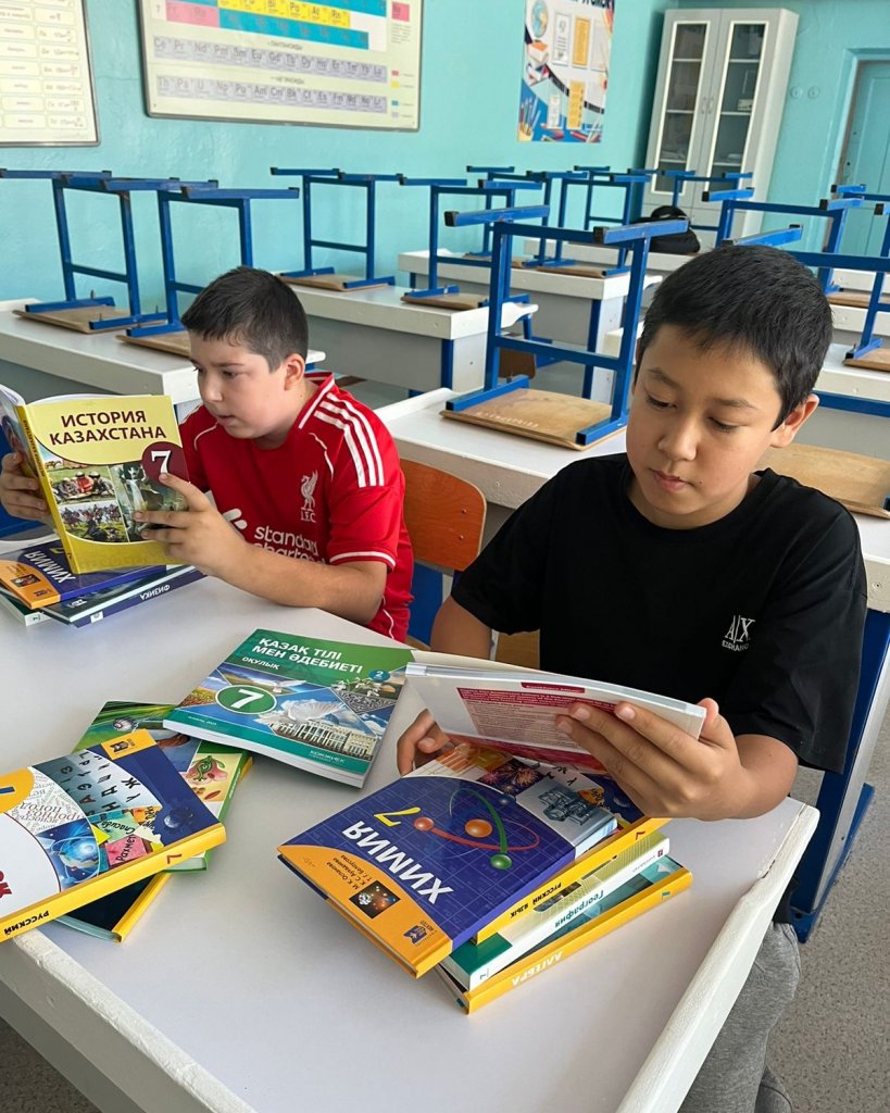 Балалар жиынтықтарын алғандарына қуанып, жаңа оқу жылының басталуын асыға күтуде! Оқушылар оқулықтармен толық қамтамасыз етілген 😊